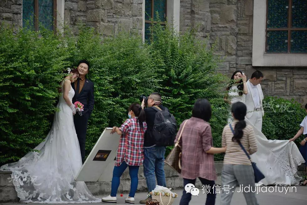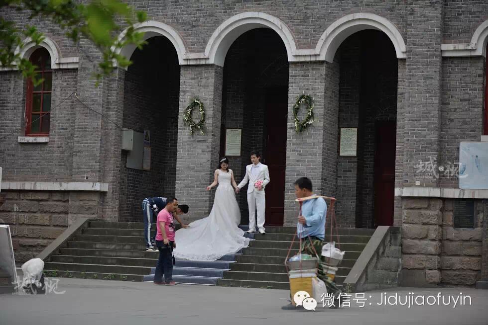 在江北区,百年教堂德肋撒堂虽然也在修缮中,但尚未动工的地方,已成为新人们的婚纱基地。