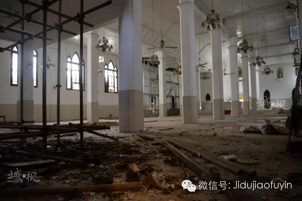 神像、桌椅早已搬至他处,唯有历经岁月的吊灯和玻璃窗还依稀可辨教堂昔日的辉煌。